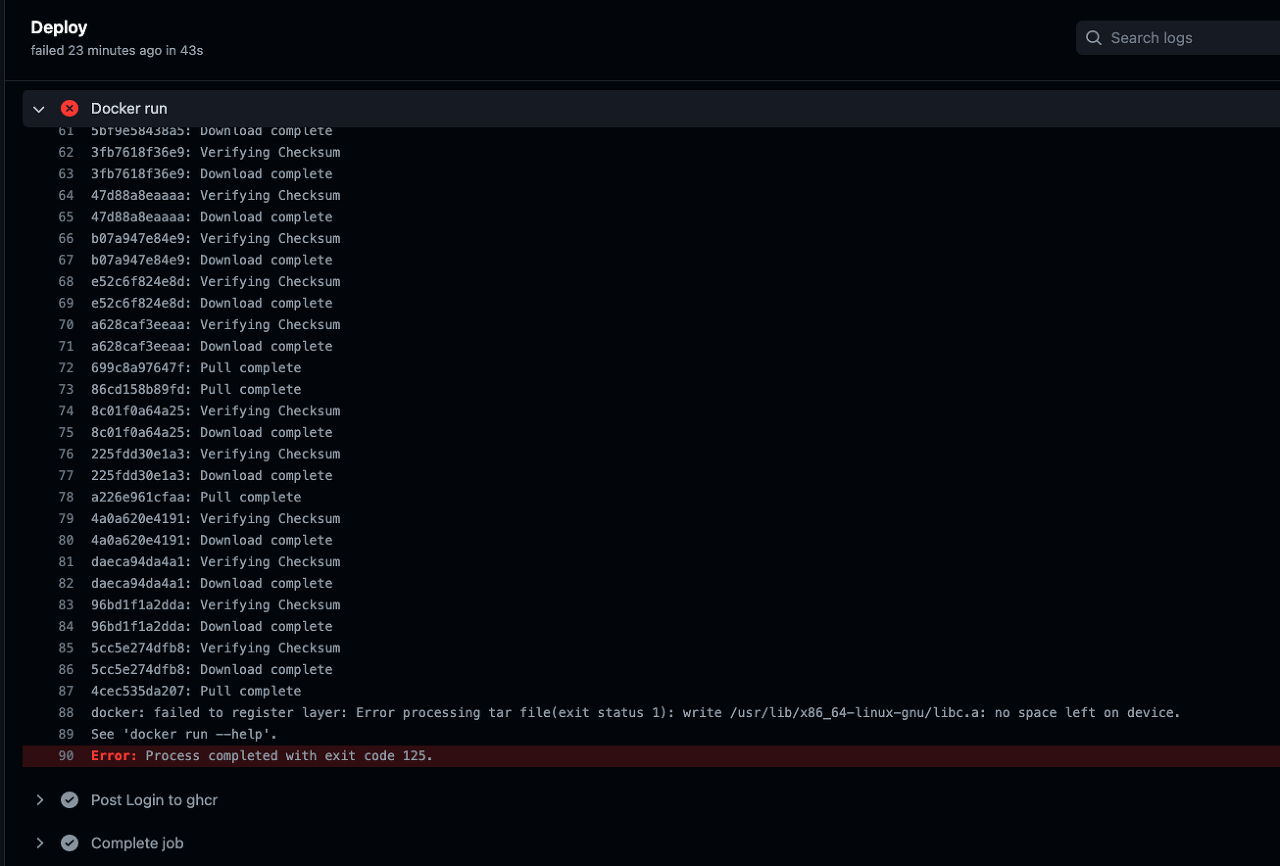 docker: failed to register layer: Error processing tar file(exit status 1): write /usr/lib/x86_64-linux-gnu/libc.a: no space left on device.