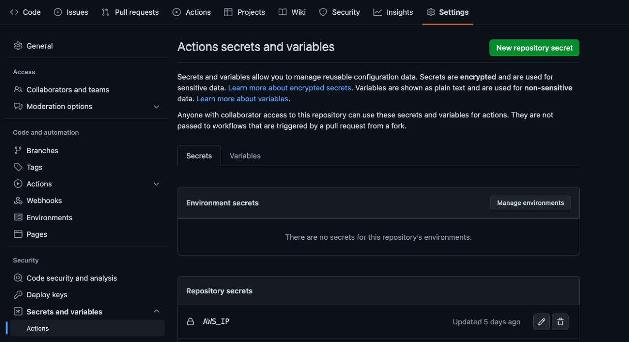 내가 사용한 방법은 깃헙 actions secrets에 원하는 변수를 넣어두고