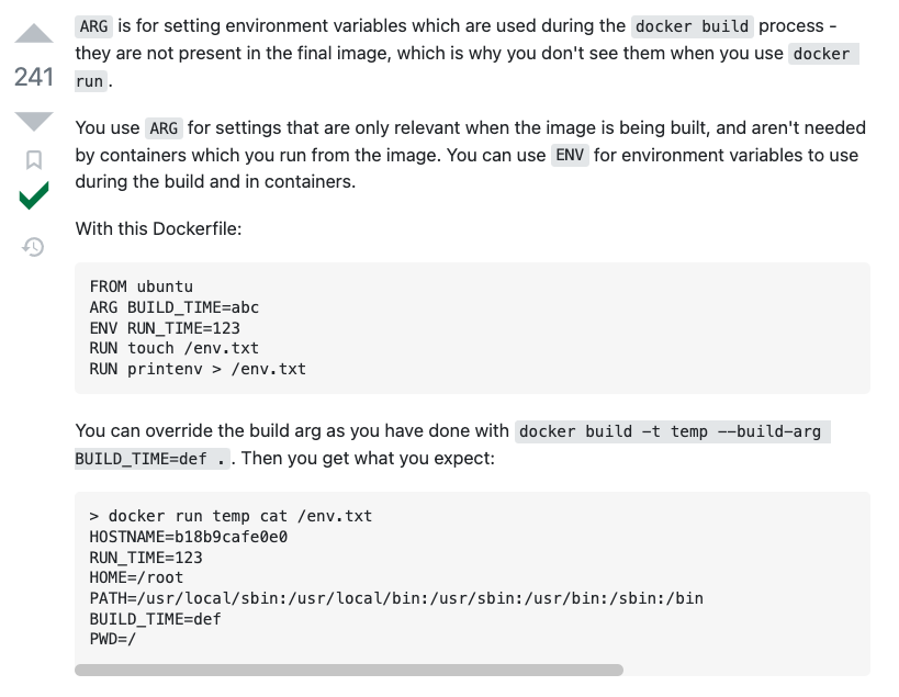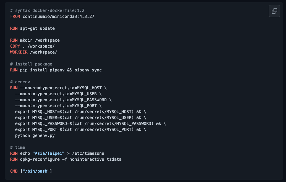 Dockerfile에서 사용함으로써 이미지가 생성될 때 해당 변수들이 .env파일에 저장되도록 했다.