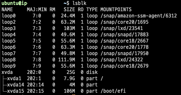 볼륨 상태에서 optimizing이 끝나면 lsblk 명령어로 확인해본다.