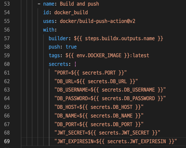 워크플로우 yml 파일 docker/build-push-action 작업의 secrets에 할당한 다음